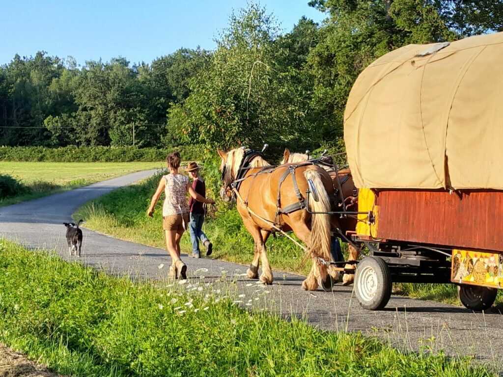 Le travail de cet été était intense et a porté ces fruits : c’est désormais en paire (avec les 2 juments attelées à l’avant) que la compagnie avance, et avec une nouvelle roulotte un peu plus grande !