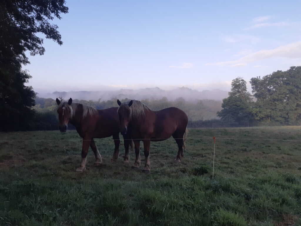 Les chevaux et la roulotte, en hivernage en sud Haute-Vienne pour l’hiver, voient d’un bel œil l’arrivée des premiers bourgeons printaniers.
